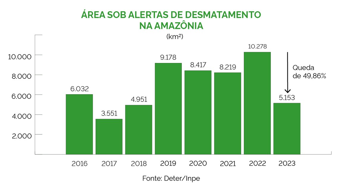 A queda do desmatamento em 2023 evitou o lançamento na atmosfera de aproximadamente 250 milhões de toneladas de gás carbônico equivalente (CO2e). Isso corresponde a cerca de 14% das emissões do Brasil, tendo como base o ano de 2020, último dado oficial disponível.