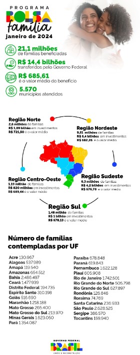 O Bolsa Família inicia o calendário de 2024 nesta quinta-feira, 18 de janeiro, com repasses do Governo Federal que chegam a 21,1 milhões de famílias (57 milhões de pessoas) nos 5.570 municípios do país. O valor médio depositado na conta dos beneficiários em janeiro de 2024 é de R$ 685,61, superior à média nacional observada nos 12 meses de 2023, que foi de R$ 670,36 (maior valor médio anual da história do programa).