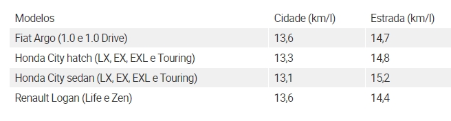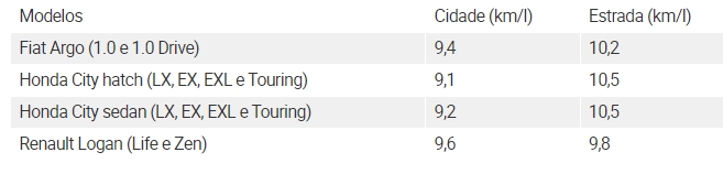 Com consumo energético de 1,53MJ/km, os modelos Fiat Argo (1.0 e 1.0 Drive), Honda City sedan e hatch (LX, EX, EXL e Touring) e Renault Logan (Life e Zen) ocupam o penúltimo lugar da lista de carros mais econômicos do país.