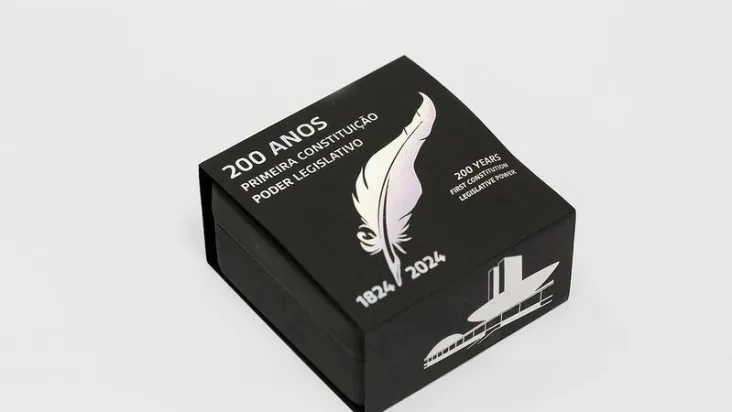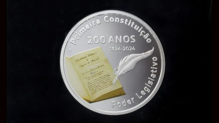 A moeda é feita de prata 999/1000 e leva, no anverso (na ‘cara’), uma ilustração detalhada da primeira Constituição, com as legendas “Primeira Constituição”, “Poder Legislativo”, “200 Anos” e “1824-2024”. Na face reversa (a ‘coroa'), é gravada uma imagem do Congresso Nacional e o valor cravado de 5 reais com a legenda ‘Brasil 2024’.