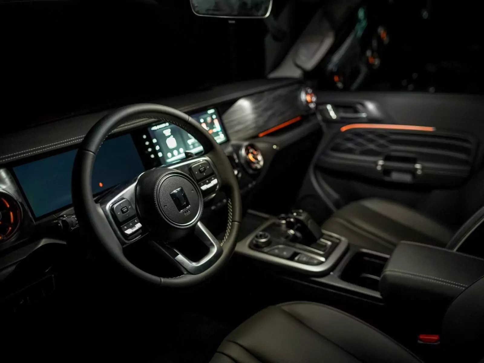 O visual do GWM Tank 300 é marcante, com faróis de LED arredondados, grade frontal com divisórias horizontais, para-choques proeminentes equipados com ganchos de reboque e estepe pendurado na tampa do porta-malas. Internamente, o acabamento em couro, o console central elevado e os elementos simulando madeira conferem um ar de sofisticação.