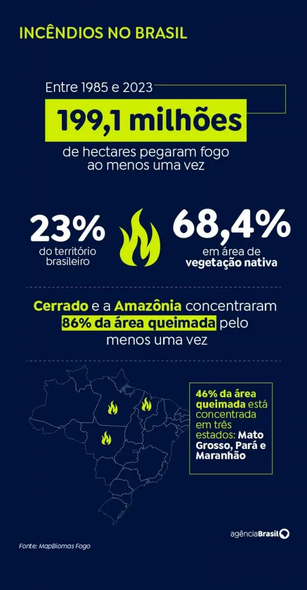 Quase um quarto do território brasileiro pegou fogo, ao menos uma vez, no período entre 1985 e 2023. Foram 199,1 milhões de hectares, o equivalente a 23% da extensão territorial brasileira.
