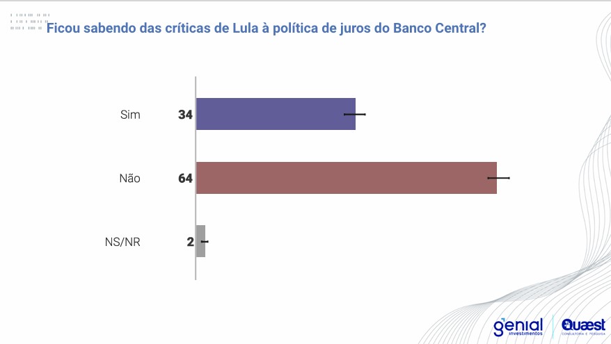 A cruzada do presidente contra o presidente do Banco Central também entrou no questionário. Apesar dos constantes comentários do Lula sobre a gestão do Roberto Campos Neto, a maioria dos entrevistados (64%) disseram não estarem sabendo das críticas de Lula à política de juros do Banco Central. 34% disseram que estavam sabendo.
