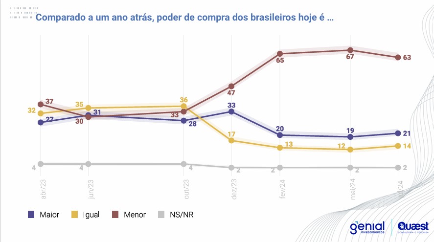 Para 63%, o poder de compra dos brasileiros hoje é menor do que um ano atrás. Já 21% acham que está maior. Enquanto 14% acreditam estar igual.