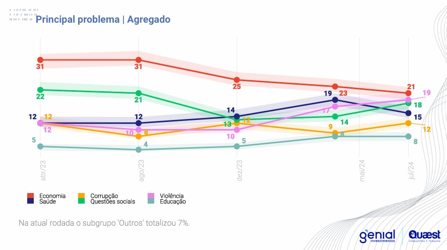 A economia é o principal problema apontado pelos entrevistados, 21% citaram essa tema, uma queda de 10% em relação à pesquisa de agosto de 2023. Neste mesmo período a preocupação com a violência subiu de 10% para 19%.