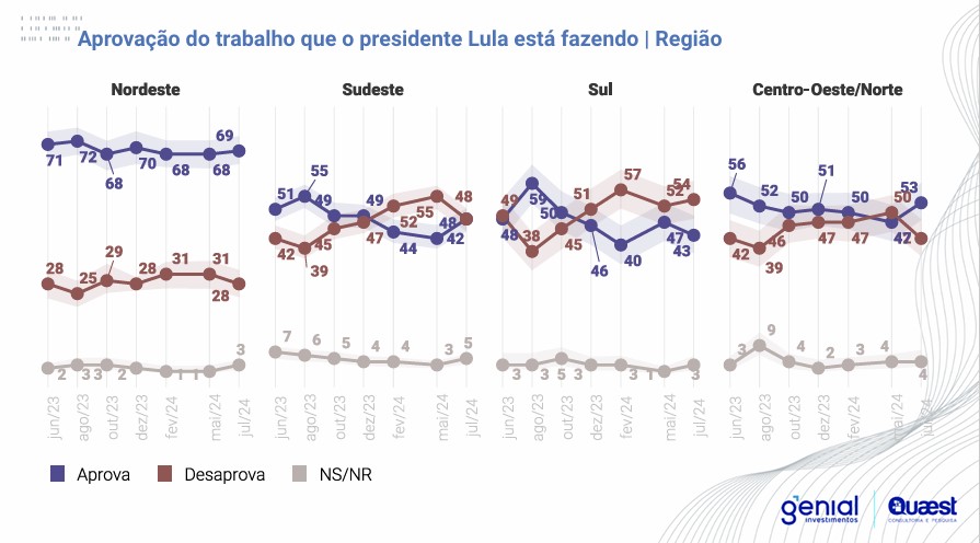 A maior variação na avaliação positiva do trabalho de Lula entre maio e julho aconteceu na região Centro-Oeste/Norte, subindo nove pontos percentuais, de 42% para 53%. Já a rejeição, que era de 50%, passou para 42%.