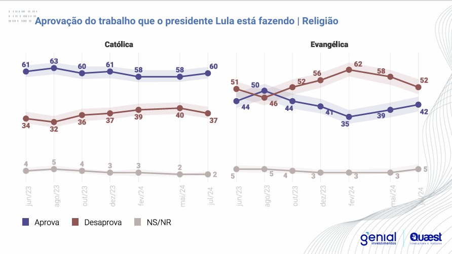 Já a aprovação entre os evangélicos passou de 39% para 342% no mesmo período. Entre os católicos, passou de 58% para 60%.