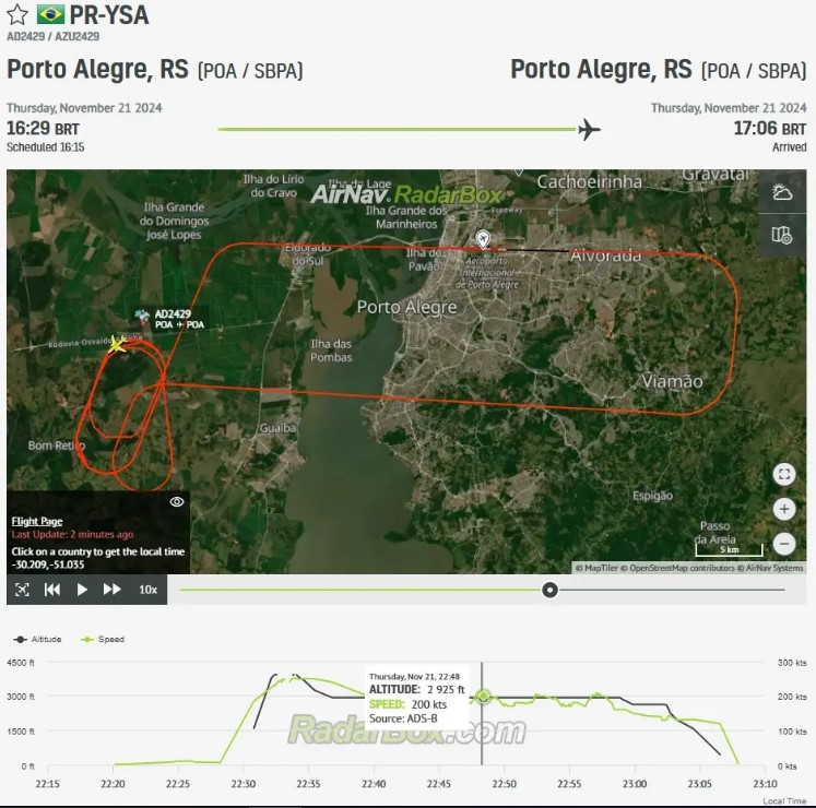 O avião tinha o Aeroporto Internacional de Viracopos, em Campinas, como destino ao deixar Porto Alegre às 16h29. Os pilotos sinalizaram “PAN PAN”, uma mensagem de urgência usada por pilotos para pedir apoio por rádio. É uma chamada internacional que indica que há uma emergência a bordo de um avião, mas que não há perigo imediato de vida ou para o veículo.