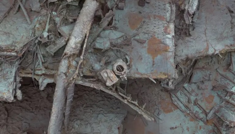 Infelizmente, os danos não podem ser vistos no escaneamento, já que a parte inferior da proa está coberta por sedimentos.
