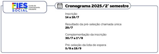 O Ministério da Educação (MEC) iniciou a convocação por meio da lista de espera do Fundo de Financiamento Estudantil (Fies), referente ao processo seletivo do segundo semestre de 2025. Os participantes ainda têm chances de ser pré-selecionados pela lista de espera, que pode ser consultada na página do Fies. As convocações ocorrem até 19 de setembro, exclusivamente pela página do Fies, onde o candidato pode acompanhar sua classificação.