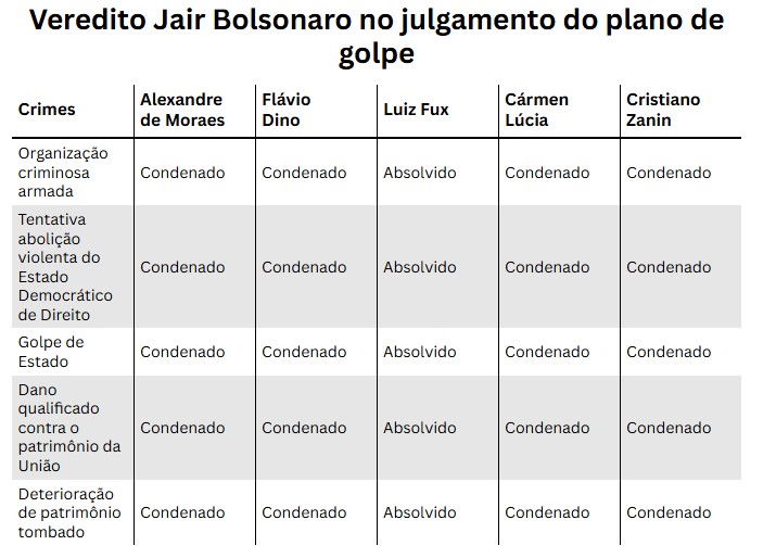 Luiz Fux: Foi o único a divergir no julgamento. Em um voto de 14 horas, defendeu a absolvição completa de Jair Bolsonaro e de outros cinco réus. Em relação a Mauro Cid e Walter Braga Netto, votou pela condenação apenas pelo crime de tentativa de abolição do Estado Democrático de Direito, rejeitando todas as demais acusações. Ao contrário dos outros ministros, Fux analisou separadamente cada crime e cada réu. Também acolheu quase todas as preliminares apresentadas pelas defesas, argumentando que houve cerceamento do direito de defesa e que o STF, assim como sua Primeira Turma, não teriam competência para julgar o caso. Logo no início de sua manifestação, ainda enviou um recado indireto a Alexandre de Moraes, afirmando que juízes não têm função investigativa e devem agir com distanciamento.