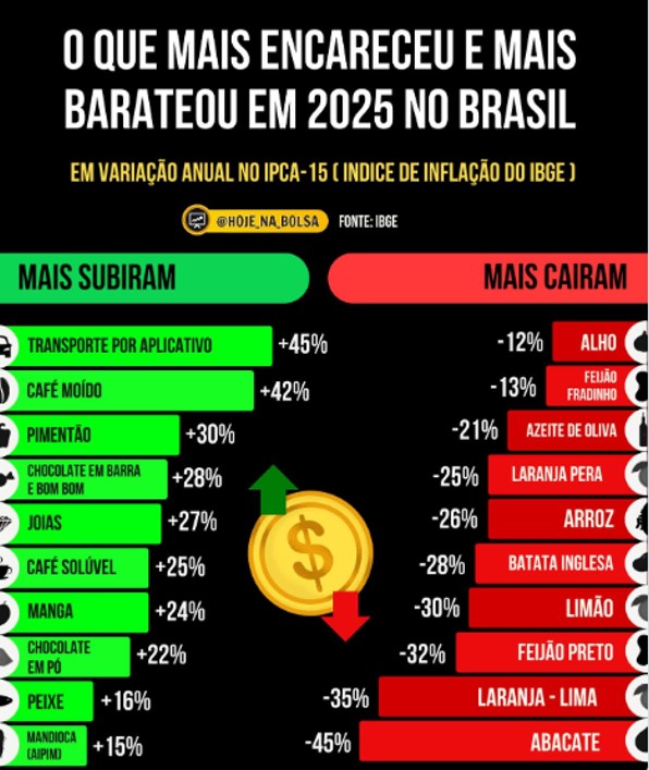 O IPCA-15, prévia da inflação calculada pelo IBGE, mostrou que 2025 foi um ano de contrastes para o consumidor. Embora o índice geral tenha desacelerado, alguns produtos e serviços subiram com força e pesaram no orçamento das famílias — enquanto outros ajudaram a aliviar a conta do supermercado.
