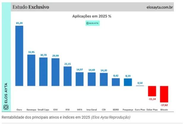Só o ouro bateu as ações: o metal que é tido como um tradicional refúgio de seguranças para os investidores em tempos de incerteza e instabilidade encerrou 2025 com alta de 65%. Na outra ponta, estão os dois únicos ativos que renderam perdas no ano: o dólar, com 11%, e o bitcoin, com um tombo de 17%.