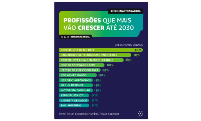 O levantamento destaca que especialistas em Big Data lideram a lista, com previsão de crescimento de 110%. Logo depois aparecem engenheiros de fintech, com alta estimada de 95%, e especialistas em inteligência artificial e machine learning, que devem avançar 85% nos próximos anos.