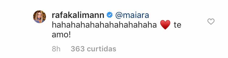 O namorado da sertaneja não parece ter ficado muito feliz, já que rebateu: “Maiara, larga de ser louca”. A mensagem foi acompanhada de símbolos de nervosismo e risos. Rafa foi um pouco mais bem-humorada e respondeu: “Maiara, te amo!”.