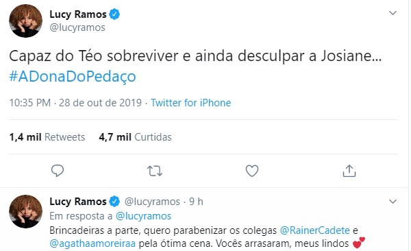 Lucy Ramos, que interpreta Sílvia, também não deixou a cena passar em branco e comentou no Twitter: “Capaz do Teo sobreviver e ainda desculpar a Josiane”, afirmou.
