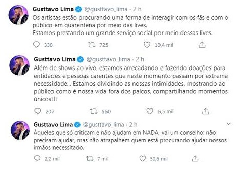 "Os artistas estão procurando uma forma de interagir com os fãs e com o público em quarentena por meio das lives. Estamos prestando um grande serviço social por meio dessas lives. Além de shows ao vivo, estamos arrecadando e fazendo doações para entidades e pessoas carentes que neste momento passam por extrema necessidade. Estamos dividindo as nossas intimidades, mostrando ao público como é nossa vida fora dos palcos, compartilhando momentos únicos! Àqueles que só criticam e não ajudam em NADA, vai um conselho: não precisam ajudar, mas não atrapalhem quem está procurando ajudar nossos irmãos necessitado", escreveu o cantor.