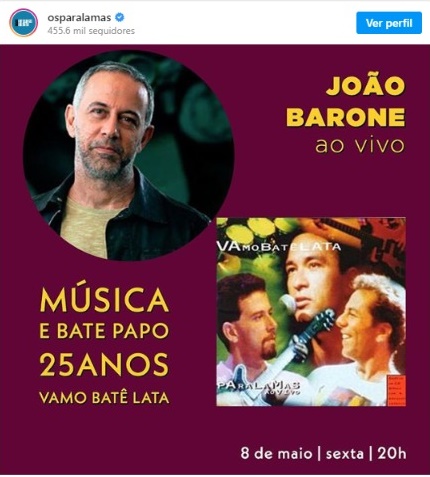 UAI - Os Paralamas do Sucesso anunciaram um bate-papo ao vivo, que ocorrerá nesta sexta-feira (08), para comemorar s 25 anos de lançamento do álbum Vamo Batê Lata, de 1995. Ás 20h, o baterista João Barone estará ao vivo em uma live para responder e conversar com os fãs da banda.