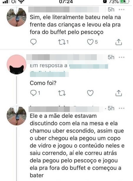 De acordo com relatos feitos no Twitter por Yaaz Lopes (testemunha) Rodriguinho teria pego Nanah pelo pescoço e a levado para fora do buffet e começado a bater nela. “Eu que estava trabalhando na festa da filha do Gaab (cantor, filho de Rodriguinho) e me vem Rodriguinho e espanca a Nanah, filho da P%$ sem educação nenhuma e respeito as crianças do local”, disse a internauta. “Sim, ele literalmente bateu nela na frente das crianças e levou ela para fora do buffet pelo pescoço”, continuou.