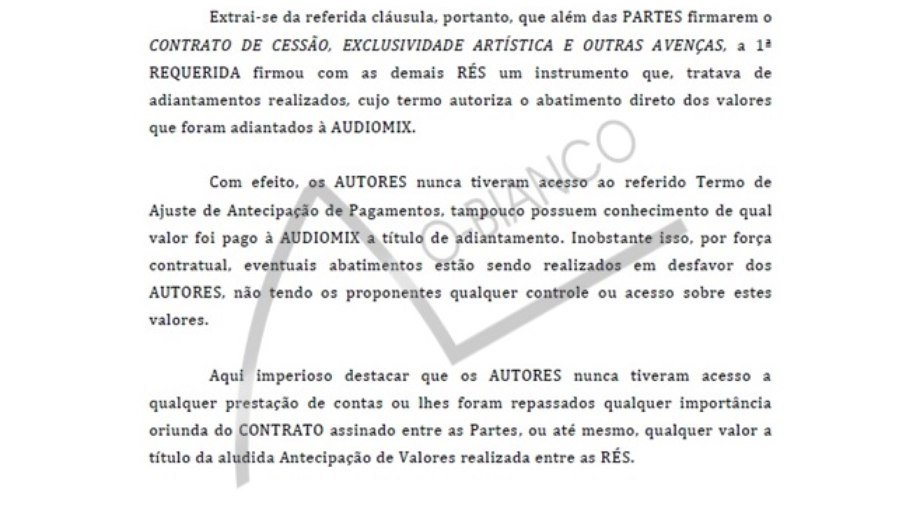Segundo a íntegra do processo que este colunista teve acesso exclusivo, a dupla havia assinado um contrato de cessão de direitos que dava a Audiomix exclusividade absoluta das interpretações sonoras e audiovisuais realizadas por eles.