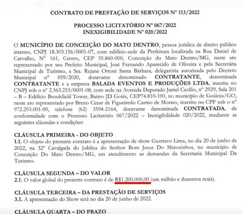 Agora, conforme o contrato ao qual a reportagem teve acesso nesta quinta-feira (26/5), Gusttavo Lima cantará em Conceição do Mato Dentro em 20 de junho por um cachê de R$ 1,2 milhão. O show do artista integra a programação do evento intitulado 32ª Cavalgada do Jubileu do Senhor Bom Jesus do Matozinhos.