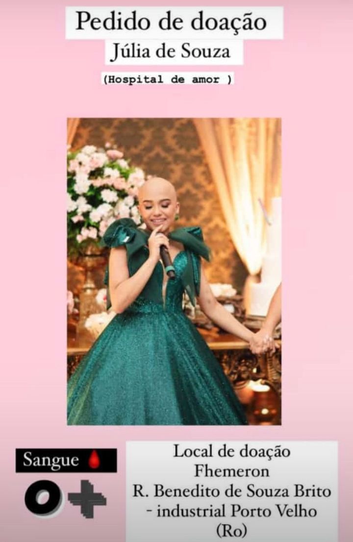 No Hospital de Amor da Amazônia, uma jovem chamada Júlia de Souza está lutando bravamente contra o câncer. Neste momento crucial de seu tratamento, ela precisa desesperadamente de doadores de sangue do tipo O+.