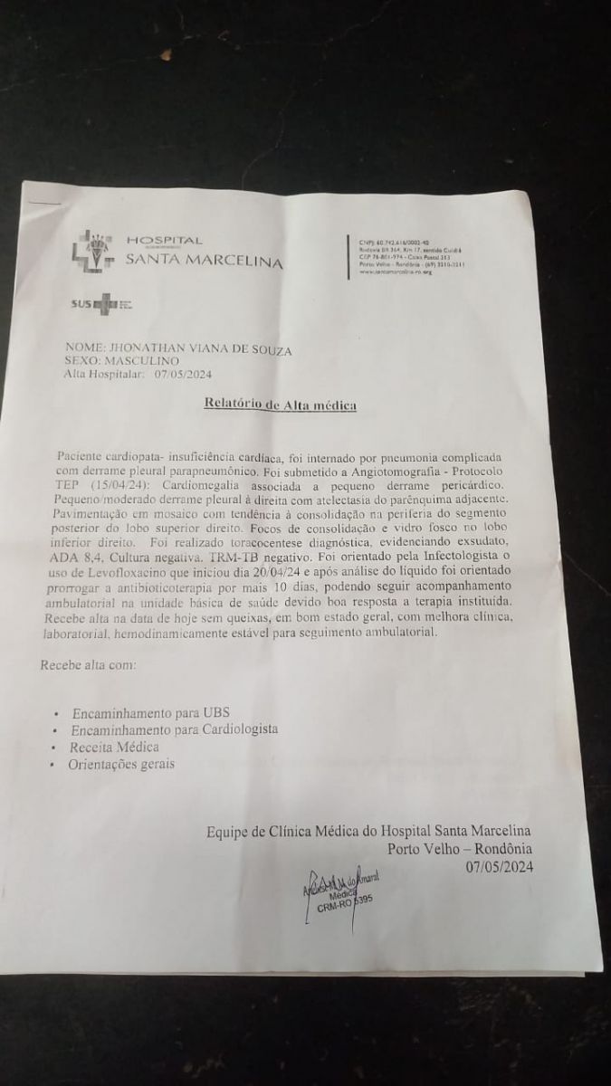 Jhonathan sofre de insuficiência cardíaca, derrame pleural e pneumonia. Para tratar essas condições, ele precisa de medicamentos contínuos, como Empaglifozina 10mg e Espironolactona 25mg, que não estão disponíveis pelo Sistema Único de Saúde (SUS). A família de Jhonathan não tem recursos financeiros suficientes para arcar com os custos desses medicamentos.