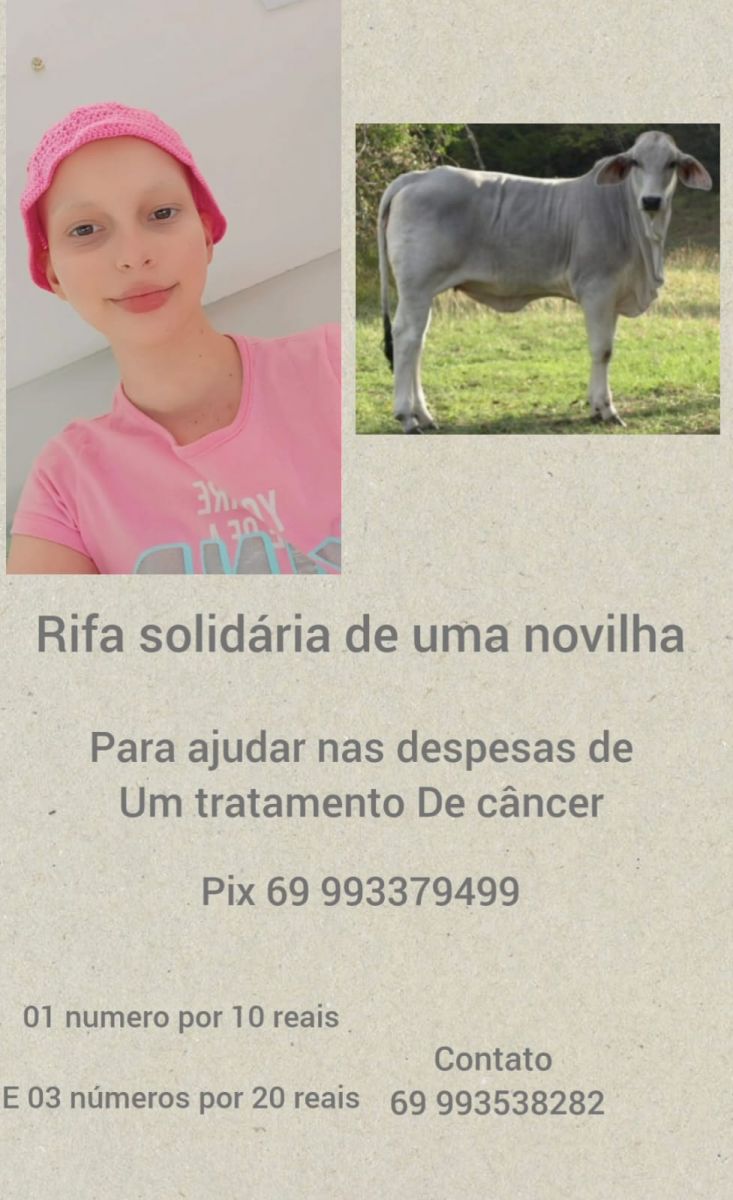 A fim de ajudar nas despesas durante o tratamento, a família está realizando uma rifa solidária. O prêmio é uma novilha, e os valores dos bilhetes são R$ 10,00 por um número e R$ 20,00 por três números. Quem puder contribuir pode adquirir os bilhetes através de um PIX para a chave 69 99353-8282, em nome de Vanessa.