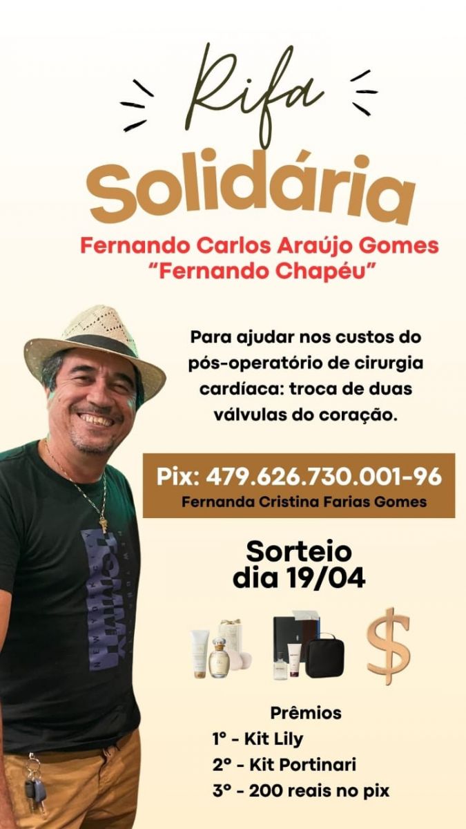 Diante de um momento delicado não apenas na saúde, mas também na situação financeira, a família de Fernando Chapéu decidiu criar uma rifa solidária para arrecadar fundos e cobrir os custos do pós-operatório. A ação busca mobilizar a comunidade, que sempre demonstrou carinho e apoio a Fernando ao longo dos anos.