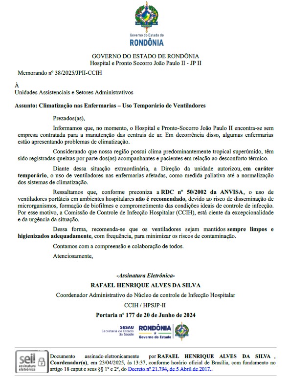 Sem contrato pra manutenção de ar-condicionado, a direção Hospital e Pronto Socorro João Paulo II autoriza uso de ventiladores de pacientes. Através do Memorando nº 38/2025/JPII, o Coordenador Administrativo do Núcleo de controle de Infecção Hospitalar, Rafael Henrique Alves da Silva, justificou que devido a queixas de pacientes e acompanhantes, a direção autorizou em caráter temporário, “o uso de ventiladores nas enfermarias afetadas, como medida paliativa até a normalização dos sistemas de climatização”.