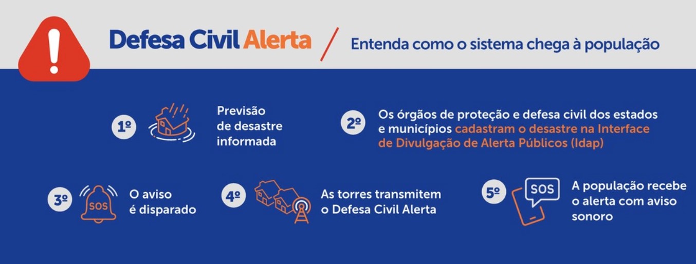 O Defesa Civil Alerta é um novo mecanismo de envio de alertas e recomendações de autoproteção em situações de desastres. O envio dos alertas é feito a partir da tecnologia de transmissão via celular, a mais avançada do mundo quando se fala em comunicação de emergências. A partir dessa tecnologia, os alertas são disparados para a população que estiver em área de risco e com cobertura de rede 4G ou 5G. As pessoas não precisam fazer cadastro prévio para receber as informações de autoproteção. Vale ressaltar que essa ferramenta é muito inovadora e, com isso, o Brasil se junta aos países mais desenvolvidos do mundo dentro da temática de desastres.
