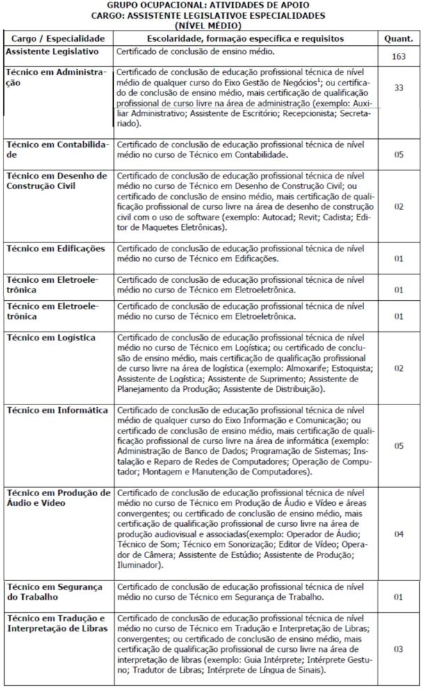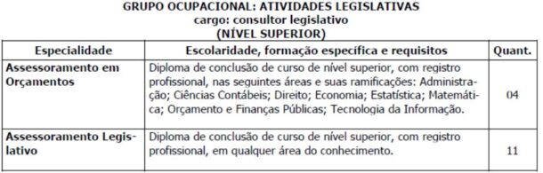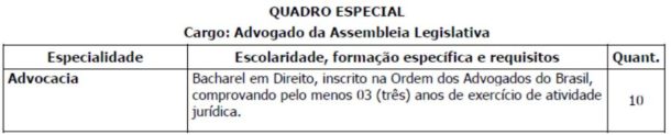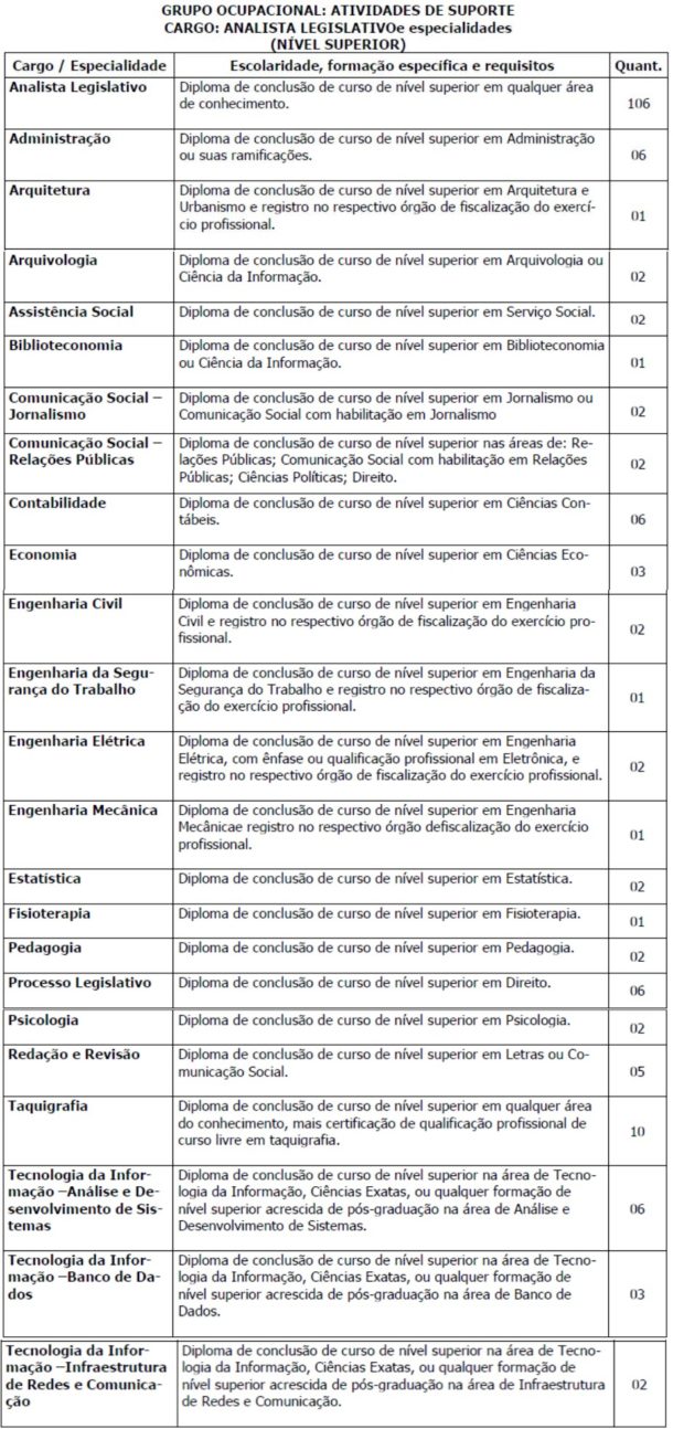 Em dezembro de 2018, foi apresentado o quadro geral das carreiras da Assembleia Legislativa. O órgão ainda não divulgou um quantitativo completo das oportunidades que serão oferecidas no certame de 2018.