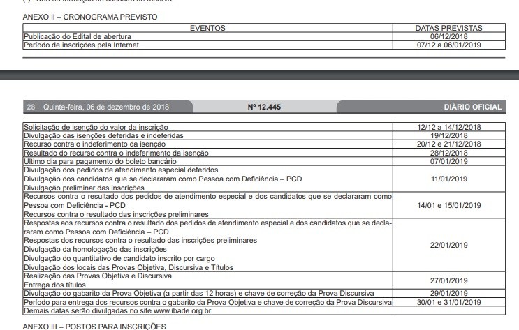 As inscrições terão início a partir desta sexta-feira, 7, até o dia 06 de Janeiro de 2019. As inscrições serão realizadas somente via Internet: www.ibade.org.br. O valor da inscrição será de R$ 72,00 (setenta e dois reais).