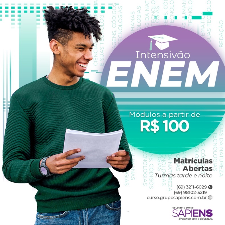 O Colégio e Curso Sapiens está com matrículas abertas para os que desejam ingressar no Intensivão Enem, com turmas disponíveis nos turnos da tarde e noite, em Porto Velho. Os módulos podem ser adquiridos separadamente, a partir de R$ 100,00. Desta forma, os estudantes podem escolher as áreas do conhecimento que mais têm dificuldade para desenvolver seus conhecimentos.
