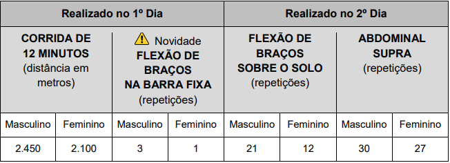 Confira a tabela com o desempenho mínimo exigido para aprovação e a aplicação dos exercícios conforme o dia: