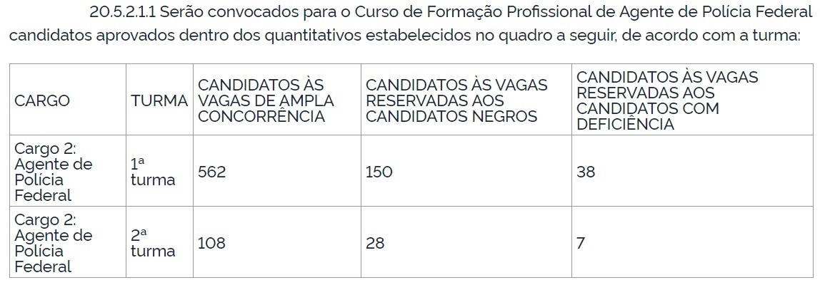 Os candidatos aprovados na primeira etapa do concurso público, até o momento não eliminados na investigação social, que enviaram os documentos previstos no subitem 20.1.2 do edital e que não forem eliminados em razão do subitem 20.1.3, serão convocados para matrícula no Curso de Formação Profissional, segundo a ordem de classificação na primeira etapa do concurso público e dentro do número de vagas previsto neste edital, respeitada a reserva de vagas para os candidatos com deficiência e para os candidatos amparados pela Lei nº 12.990/2014.