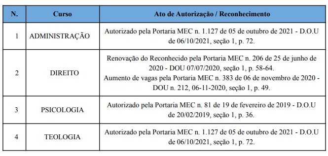 O curso de Administração terá a duração de quatro (4) anos, com 120 vagas; Direito cinco (5) anos, com 150 vagas; Psicologia cinco (5) anos, com 90 vagas; e o de Teologia quatro (4) anos, com 90 vagas.