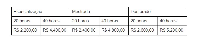 A remuneração muda de acordo com a carga horária e nível de formação. Confira abaixo: