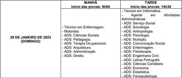 As provas objetivas e discursivas, previstas para 29/01/23 (domingo), serão realizadas nas cidades de Porto Velho, Ariquemes, Cacoal, Guajará-Mirim, Jaru, Ji-Paraná, Ouro Preto do Oeste, Rolim de Moura e Vilhena, todas do Estado de Rondônia, em dois turnos, conforme tabela baixo: