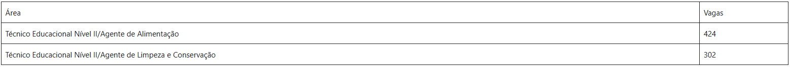 No total são 726 vagas para candidatos que possuem o ensino médio completo aos cargos de Técnico Educacional Nível II de Agente de Alimentação e Agente de Limpeza e Conservação, conforme a tabela a seguir:
