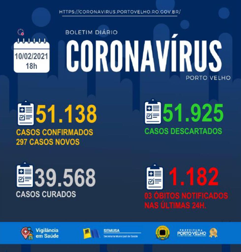 De acordo com a prefeitura até o último dia 10 de fevereiro de 2021 morrem na capital do Estado 1.182 pessoas infectadas pela COVID-19. Porém de acordo com a SESAU, em boletim divulgado no portal do Governo o numero de mortos até o momento em Porto Velho era de 1.112 cidadãos.
