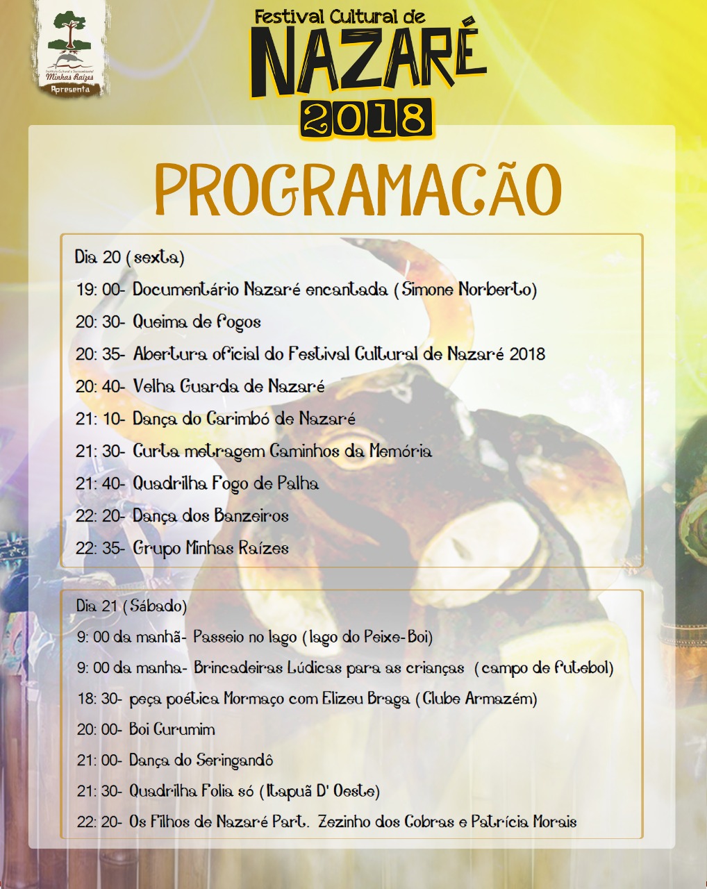 A festa deste ano de 2018, começa nesta sexta feira dia 20, com a seguinte programação: Documentário - Encantada Nazaré (Simone Norberto); as 20h30 – Queima de fogos; 20h35 – abertura Oficial do Festival de Nazaré; 20h40 – Velha Guarda de Nazaré; 21h30 – Curta Metragem Caminhos da Memória; 21h40 – Quadrilha Fogo de Palha; 22h20 – Dança dos Banzeiros; 22h30 – Grupo Minhas Raízes e logo depois, a dança da quadrilha “Caminho da Roça” de Conceição do Galera; Isto é só a programação do primeiro dia da festa, que também oferece diversidade em pratos de comidas típicas regionais além de comercialização de artesanato.