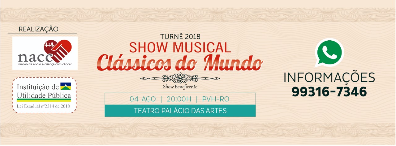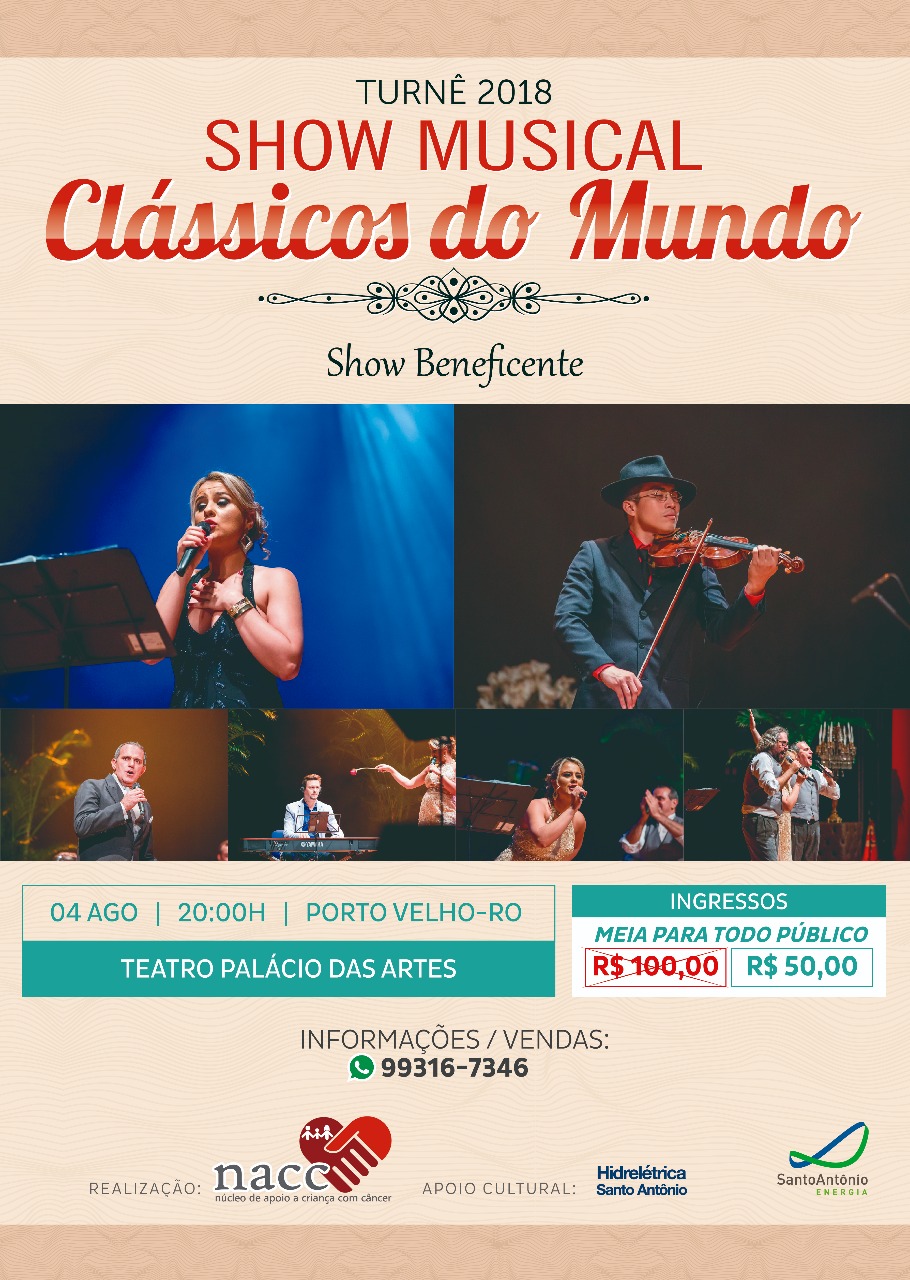 Será neste sábado, 4, o espetáculo musical “Clássicos do Mundo”, no Teatro Estadual Palácio das Arte, localizado na avenida Presidente Dutra, 4183, bairro Olaria. O evento é em prol do término da construção da nova sede do Núcleo de Apoio à Criança com Câncer (NACC).