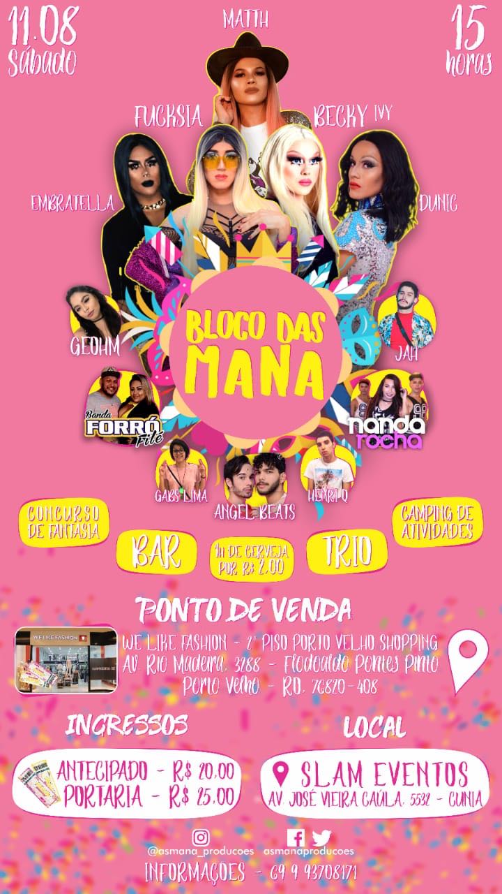 O Bloco das Mana tem por objetivo destacar a diversidade do público LGBTQ+, na capital. As principais atrações do carnaval serão, o Concurso a Fantasia (com premiação surpresa) e a apresentação das maravilhosas drags, Matth, Fucksia, Becky, Dunic e Embratella. Além disso, o evento terá a presença da banda Forró Filé, Gabs Lima, Angel Beats, Henri Q, Jah e em especial a cantora Nanda Rocha. E não é só isso. Todas as Manas terão um camping de atividades para melhor interação com as outras, com diversidades de músicas funk, axé, eletrônica, forró e muito mais.