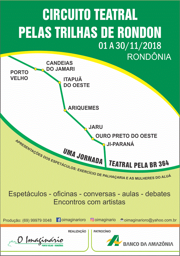 O Imaginário (RO) inicia o Circuito Teatral pelas Trilhas de Rondon – Uma jornada teatral pela BR 364. O projeto, contemplado pelo Edital do Banco da Amazônia 2018, leva atividades e apresentações teatrais a municípios rondonienses. A jornada tem início no dia 1º de novembro. A trupe segue com as produções: Exercício de palhaçaria, uma performance de circo e As Mulheres do Aluá, teatro adulto. Além das apresentações serão realizadas conversas, encontro de artistas, aulas espetáculos, debates e oficinas.