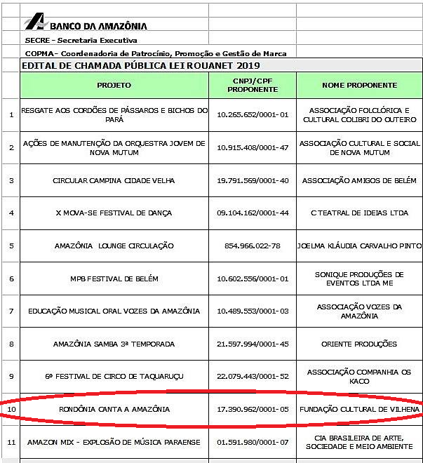 A Fundação Cultural de Vilhena (FCV) foi contemplada em um edital do Basa (Banco da Amazônia) e receberá da entidade o valor de R$ 120 mil para a realização de um grande festival de música regional com premiações aos participantes como forma de incentivo à música autoral da região.