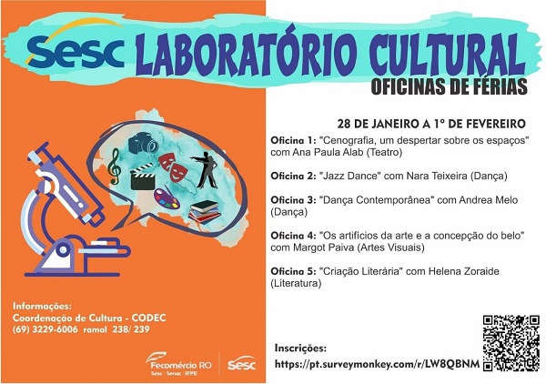 Como parte das ações de aperfeiçoamento do fazer artístico, o Sesc realizará a partir de 28 de janeiro o Projeto Laboratório Cultural. Este projeto tem o objetivo de oferecer ações formativas nas 05 linguagens artísticas de atuação da Coordenação de Cultura, a saber: Artes Cênicas, Artes Visuais, Audiovisual, Música e Literatura. Esta coordenação entende o laboratório cultural como um espaço de construção coletiva, abarcando pesquisas, experimentações, discussões e processos de criação artístico-culturais.