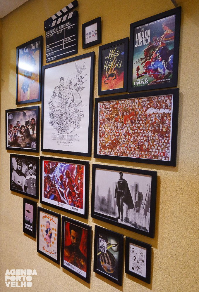 O universo dos quadrinhos está em exposição nas paredes e até na porta dos banheiros. Muitas das obras têm a assinatura dos artistas.