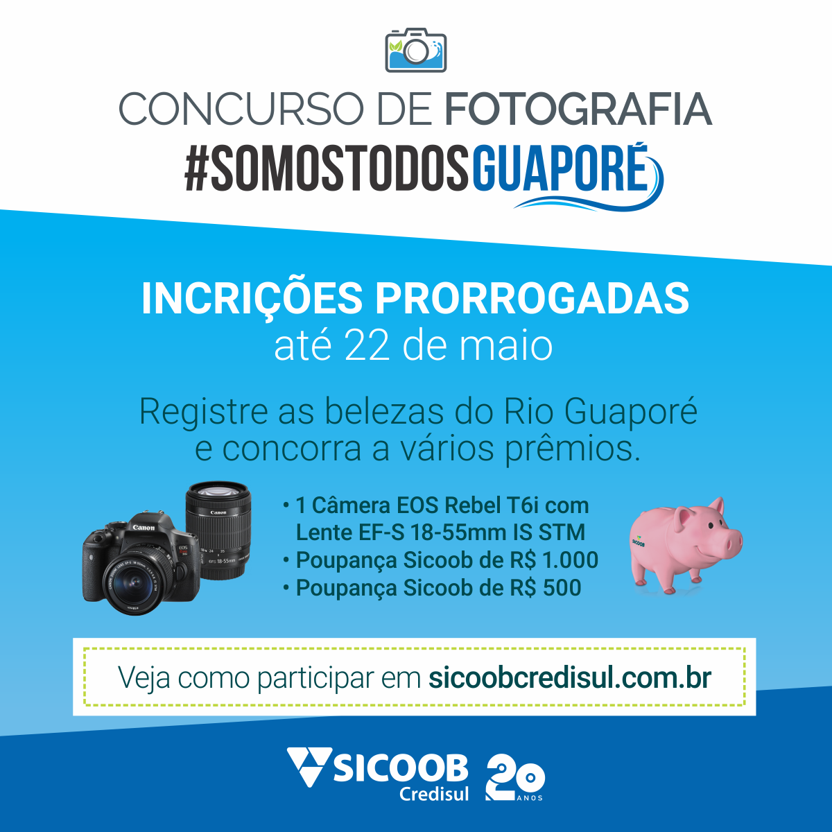As inscrições para o concurso de fotografia Somos Todos Guaporé, lançado em março pela Sicoob Credisul, teve o prazo prorrogado para o dia 22 de maio. O concurso é aberto para profissionais e amadores e tem como objetivo proporcionar aos amantes da fotografia a oportunidade de registrar as diversidades atrativas do Vale do Guaporé.