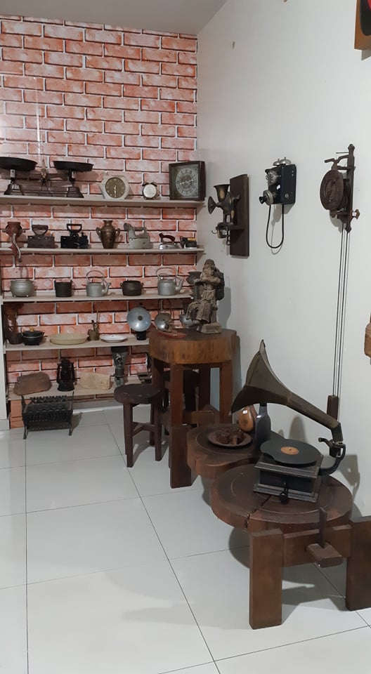 São mais de 200 peças, entre elas esculturas, peças de artesanato, móveis antigos, máquinas de escrever, câmeras, celulares, telefones antigos e muito mais.